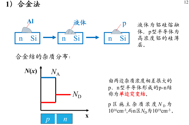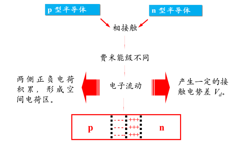 p-n结接触空间电荷取的电势能从n$\to$p区升高,势垒高度 $qV_d=E_{F_n}-E_{F_p}$.