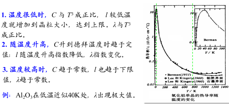 低温下(小于德拜温度)散射减弱,热导率主要取决于自由程$l\to e^{\frac{\Theta_D}{T}}$