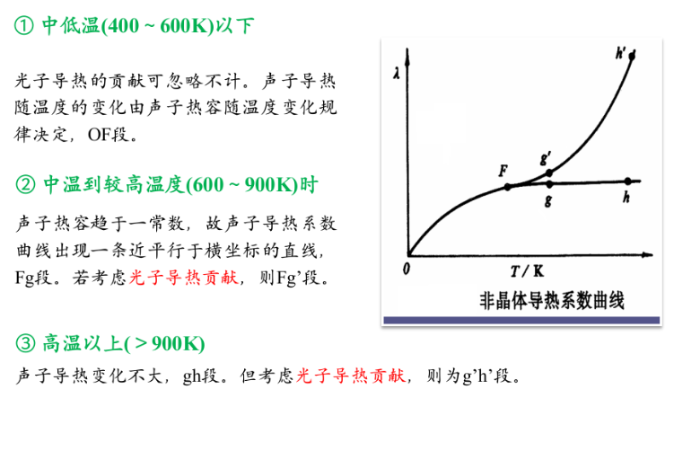 玻璃体的热导率碎温度升高而增大,高于773K时,辐射传热使得热传导有较快上升$\lambda=cR+d$